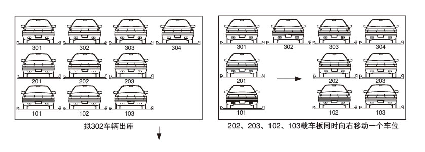 頂層車板上下升降,底層車扳左右水平橫移,中間層車板既可左右橫移叉可上下升降,通過不斷交換空位,完成車輛存取。